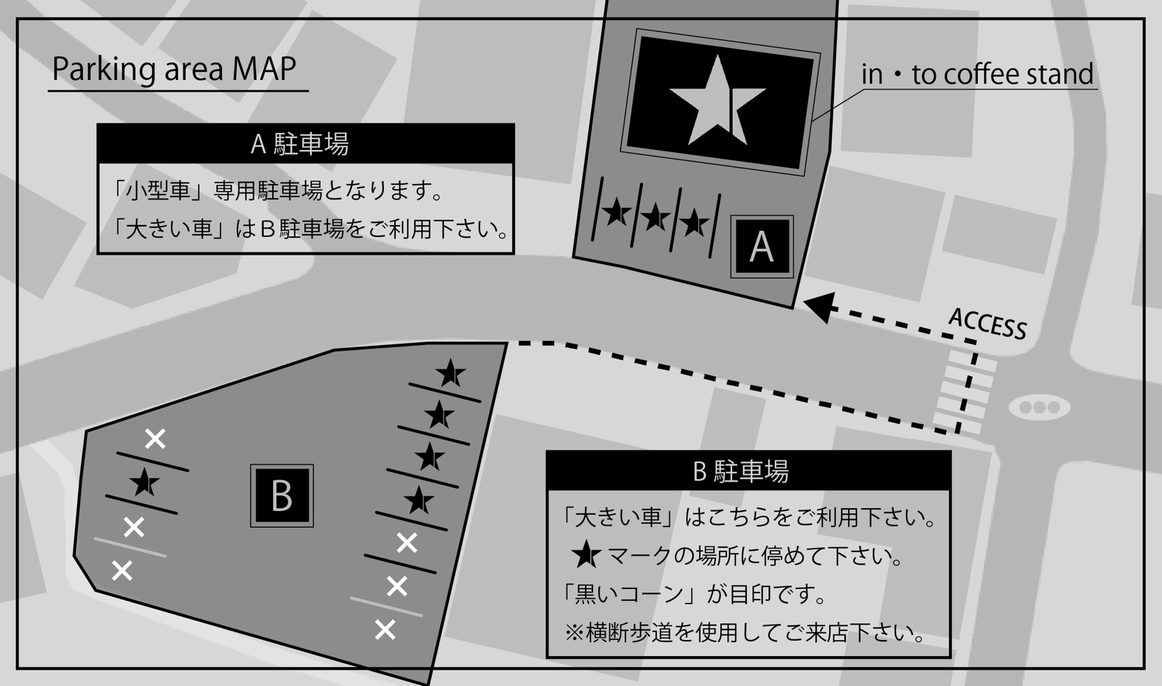 店舗前A駐車場に3台(※小型車専用)と向かい側に5台分の駐車スペースが準備してあります。大型車でお越し際は、見通しの良いB駐車場をご利用ください。黒いコーンが目印です。また、安全の為押しボタン式の横断歩道をご利用下さい。意外とすぐ青信号になりますので、まずは外観とお店までの道のりをお楽しみいただけると嬉しいです。