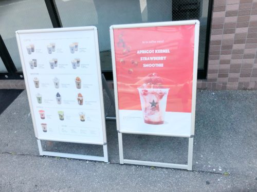 外の看板にはとてもおしゃれなドリンクが!写真は人気の杏仁ストロベリースムージーです。