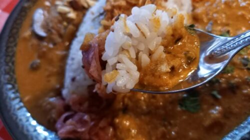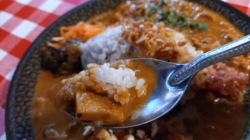 ココナッツカレーは魚介出汁で和風、ですがスパイスが効いていて旨味たっぷり。