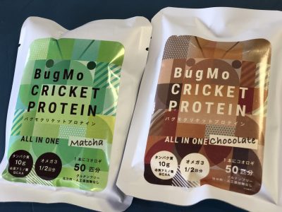 これが、コオロギパウダーが入ったチョコですね。1本にコオロギ50匹分!プロテインも配合されていますよ。味はチョコと抹茶味があります。