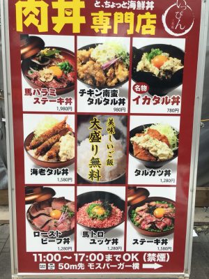 「いっぴん」のランチの売りは肉系の丼。馬ハラミステーキやローストビーフ等の丼メニューがメインになっています。ご飯の大盛り無料という、うれしいサービスも。