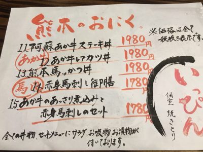 熊本が誇る阿蘇あか牛や馬カツ、馬刺しのメニューもあります。