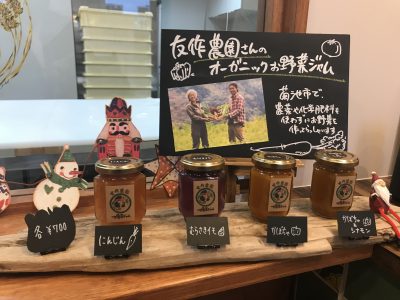 店内にはジャムも販売されており、すべてオーナー夫婦が選んだこだわりの熊本県産オーガニックジャム。にんじん、むらさきイモ、かぼちゃ、かぼちゃ&シナモンの4種類があります。