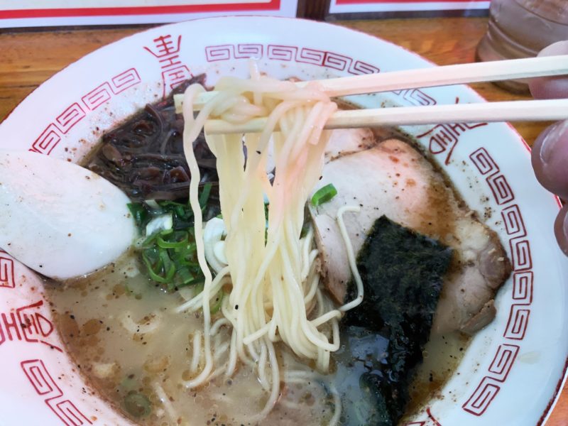 麺は細麺でもちもちしています。熊本でここまで細いのは珍しいですが、しっかりスープが絡んでくれています。