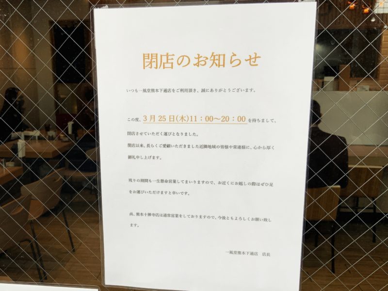 この「一風堂 熊本下通店」が、3月25日(木)の11:00~20:00の営業を持って、閉店するそうです。
