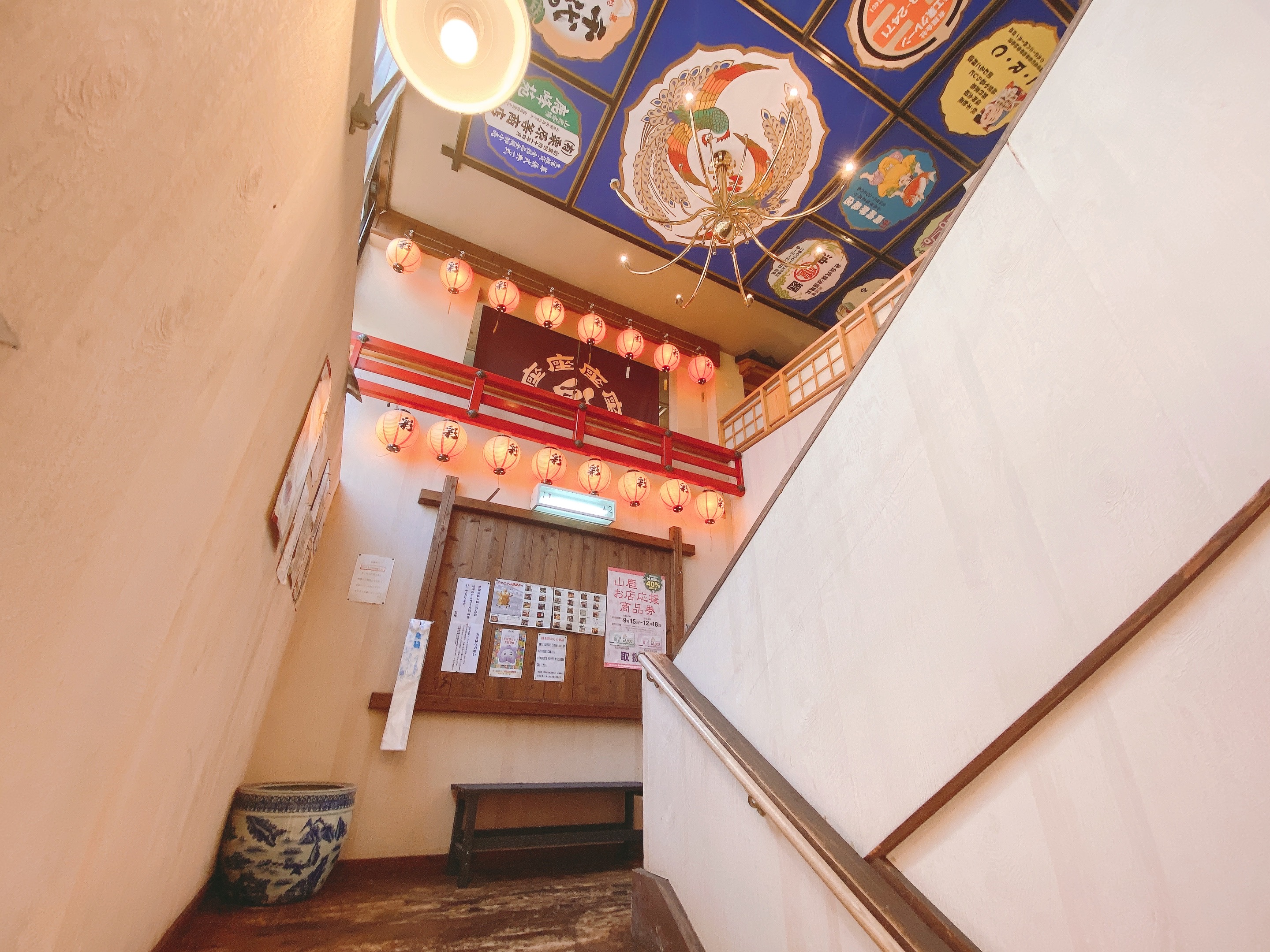 入ってすぐ階段があります。この雰囲気、八千代座の天井と一緒だ!