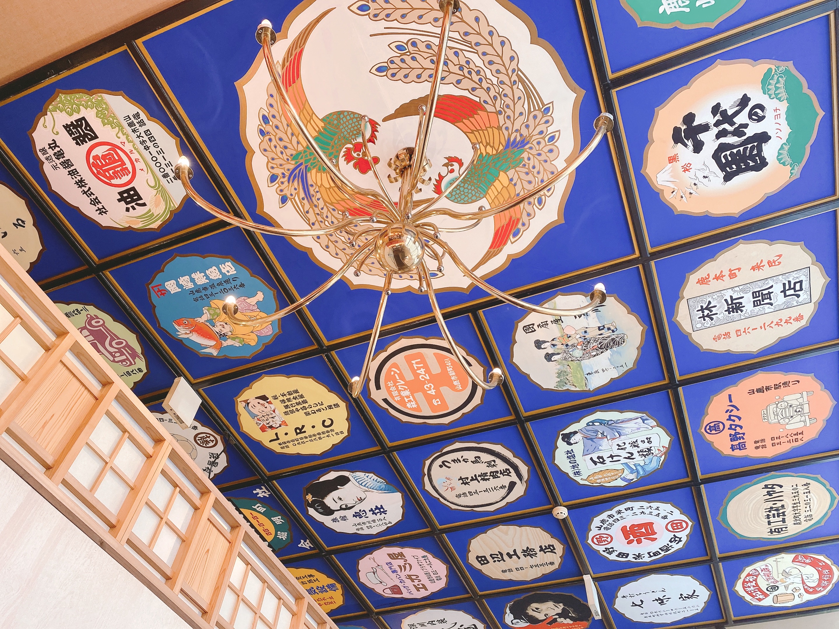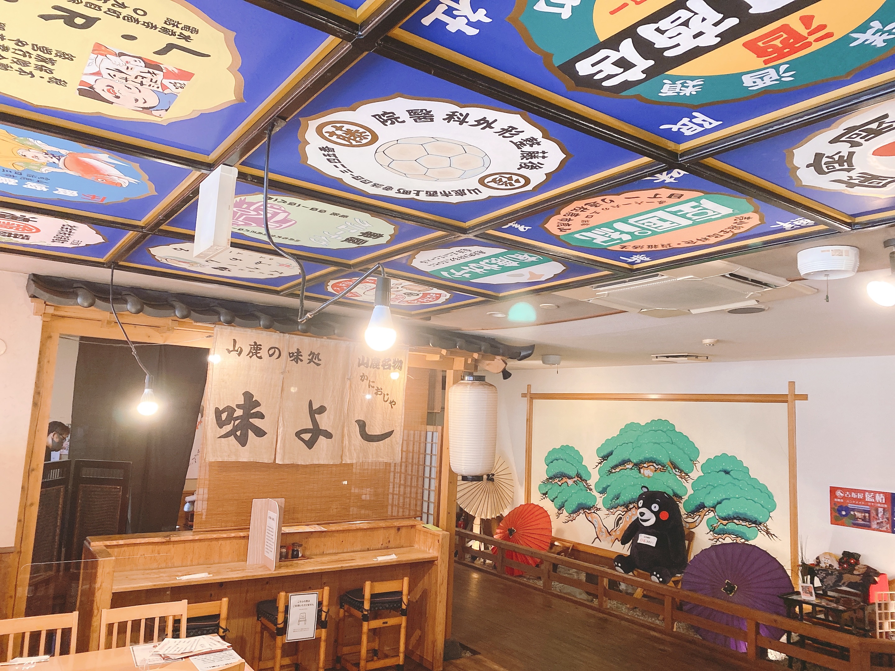 天井はこんな感じ。山鹿のお店のロゴがびっしり。