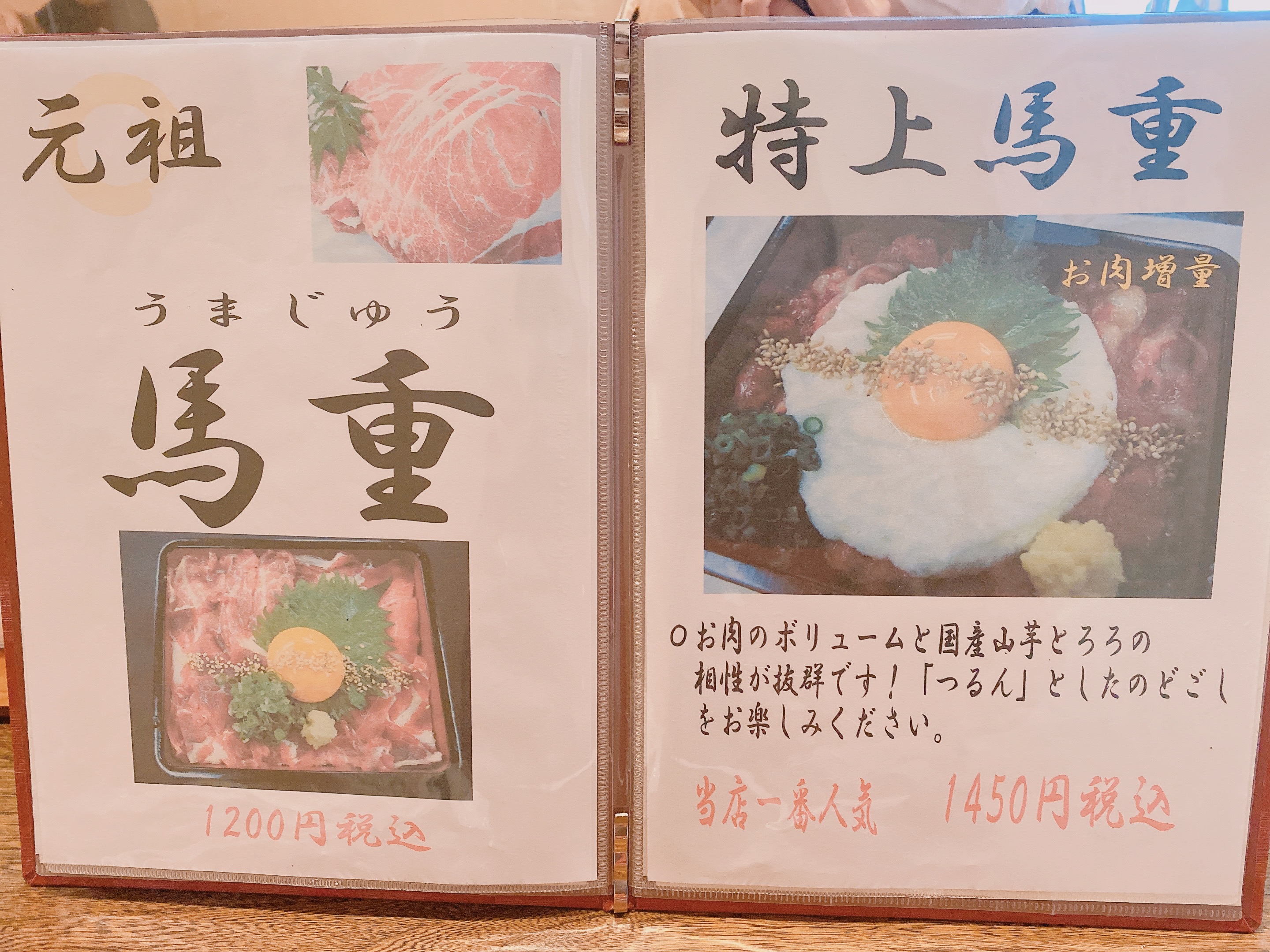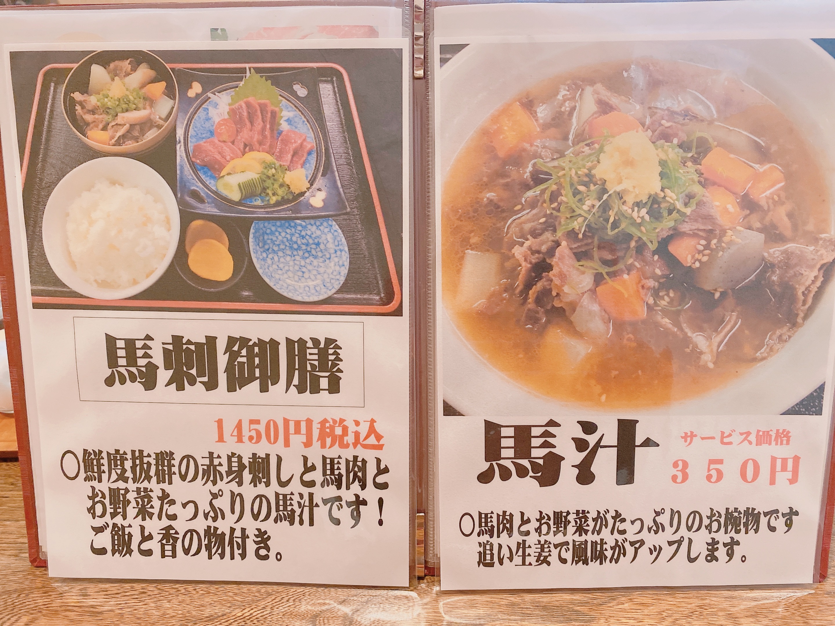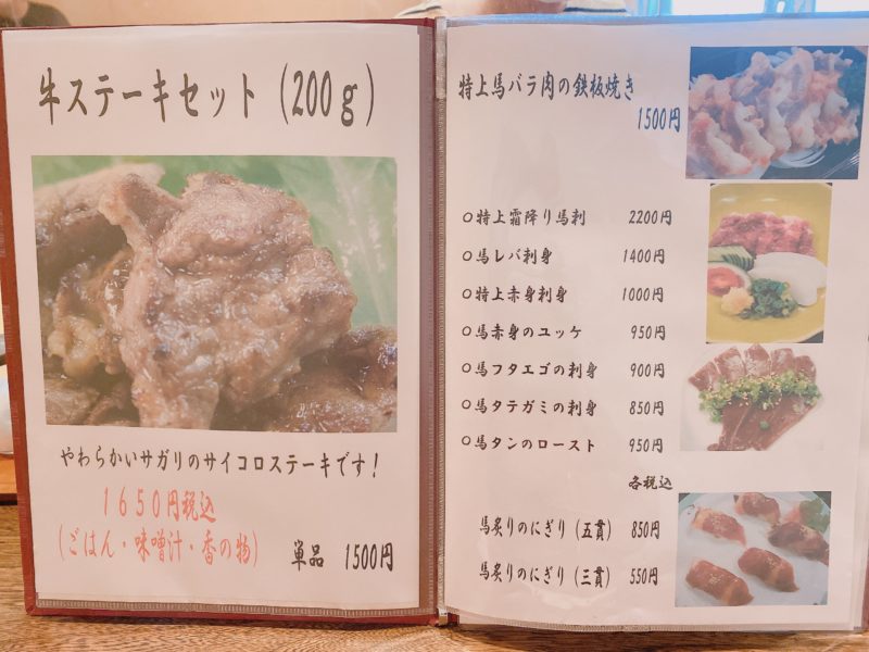 牛ステーキから、馬肉料理がならびます。特上馬バラ肉の鉄板焼きとか美味しそう!と思いながらページをめくると