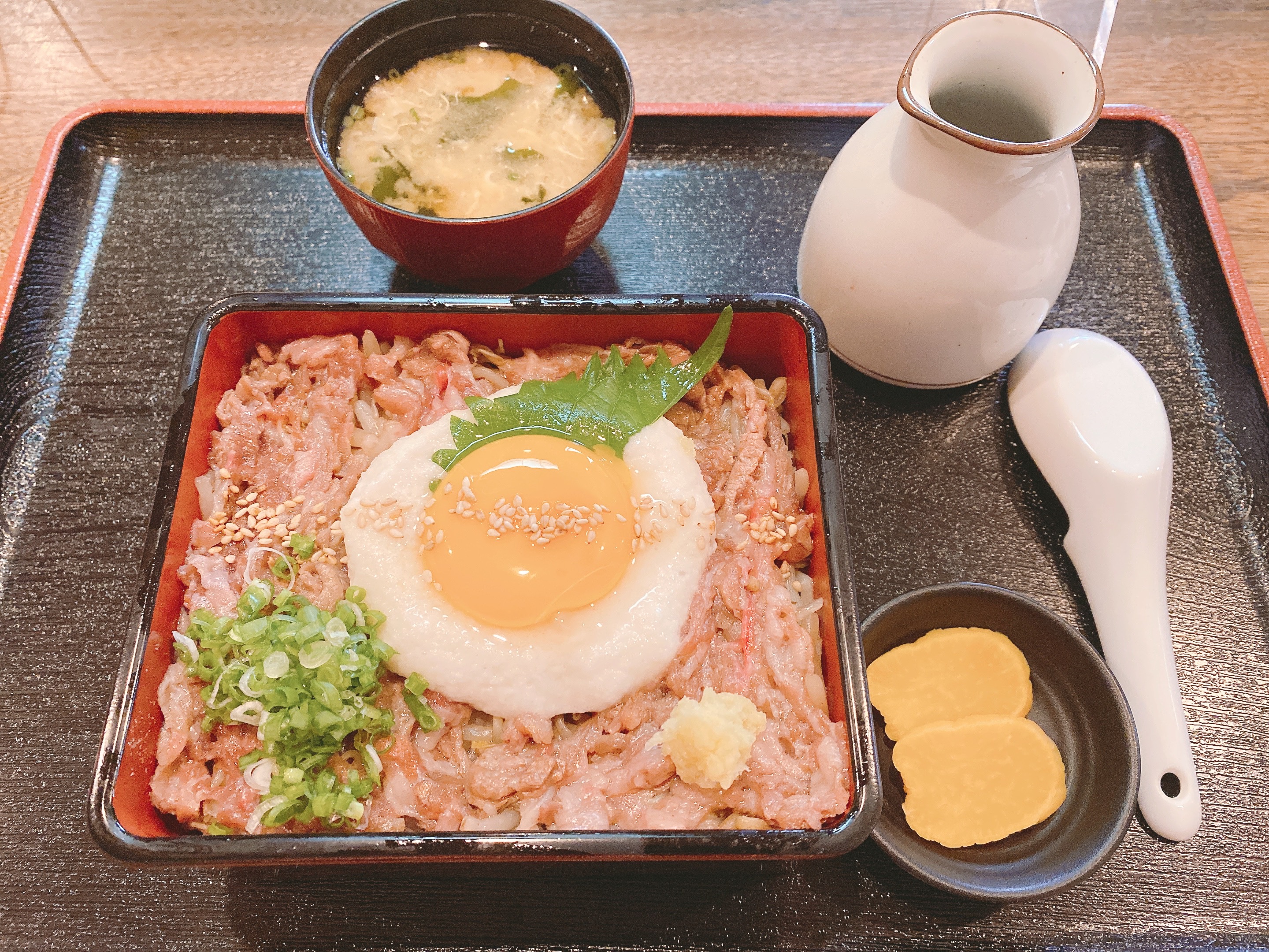山芋の上にのった卵と馬肉のピンク色の彩が鮮やかです!