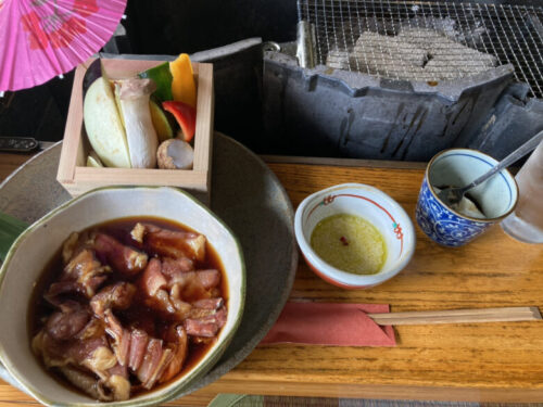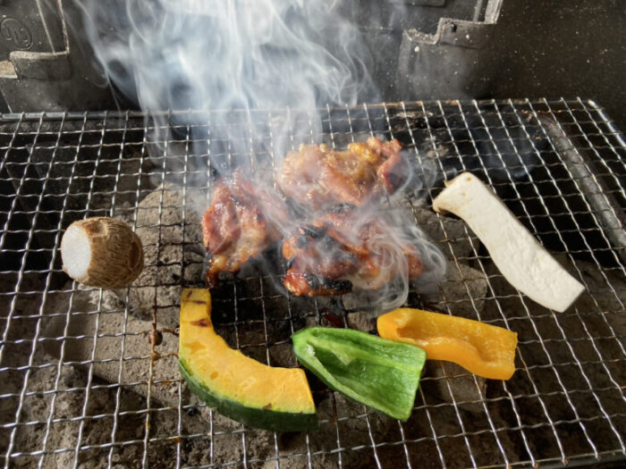 かまどご飯が炊けるまでは20分ほど。その間にのんびり囲炉裏でお肉を焼きましょう。