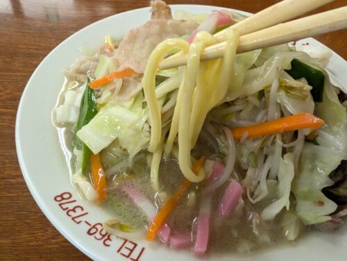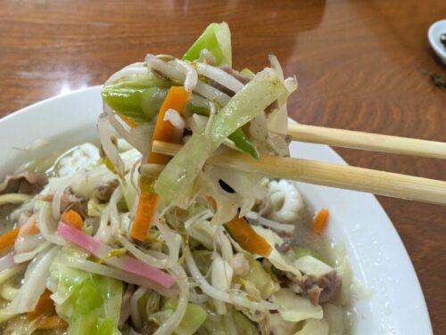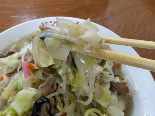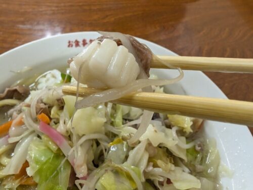 野菜を脇に集め、掘り出したちゃんぽん麺は太麺で、コシがあり、野菜の歯ごたえに負けない麺でした。