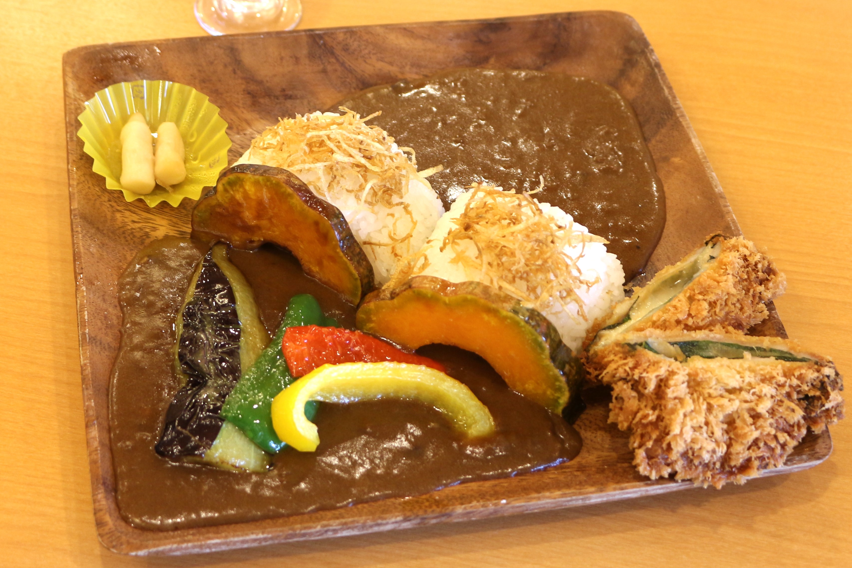 上から見ると、2つのご飯の山がキレイに石橋を再現されています。このかけはしカレーには、2種類のカレールーが掛かっています。さらに、人気の生姜カツもトッピングされていて豪華です。