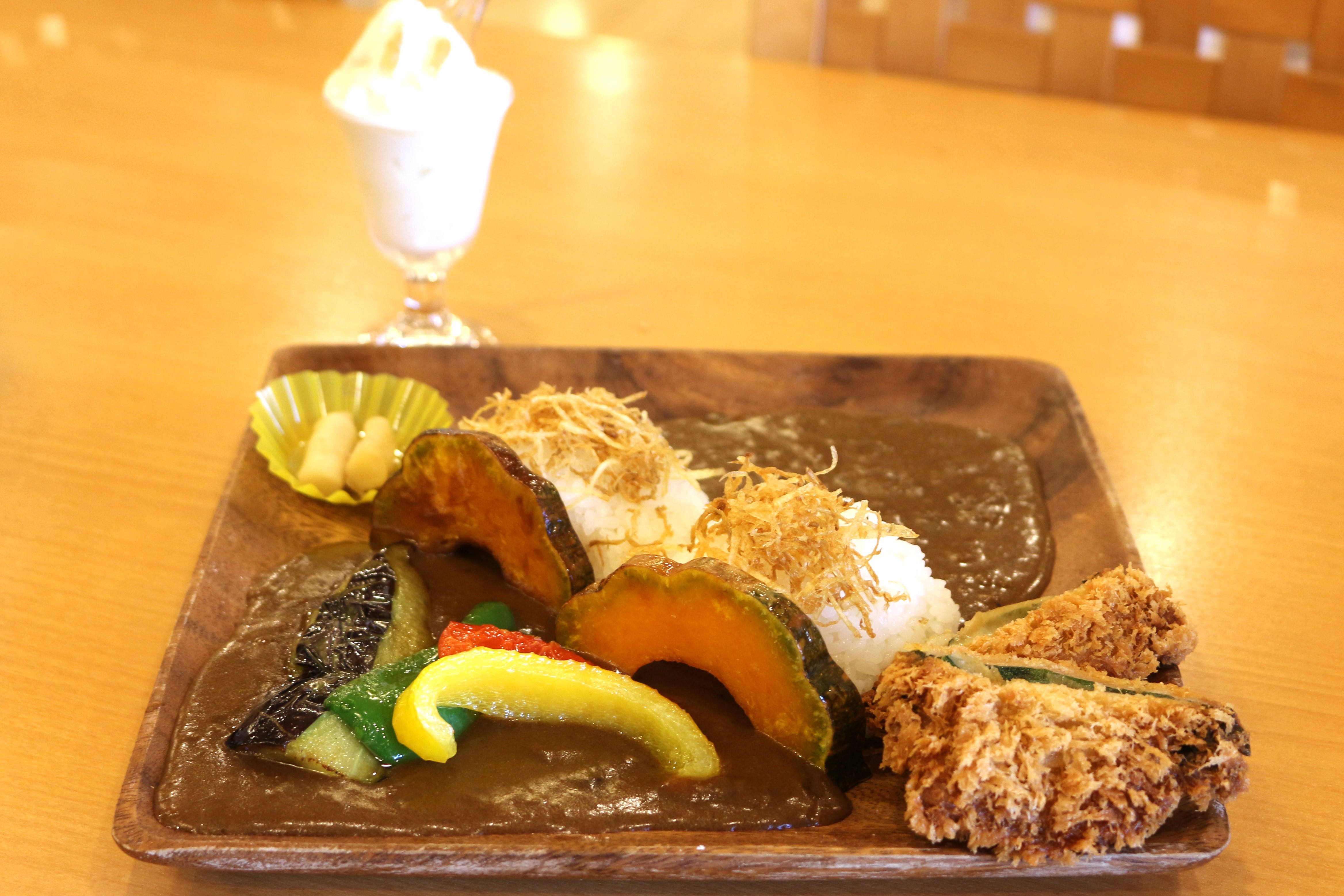 お店のもう一つのおすすめメニューはこちらのかけはしカレー(980円/ミニ生姜ソフトクリーム付き)。「道の駅東陽」の石橋をモチーフにしたカレーなんです。
