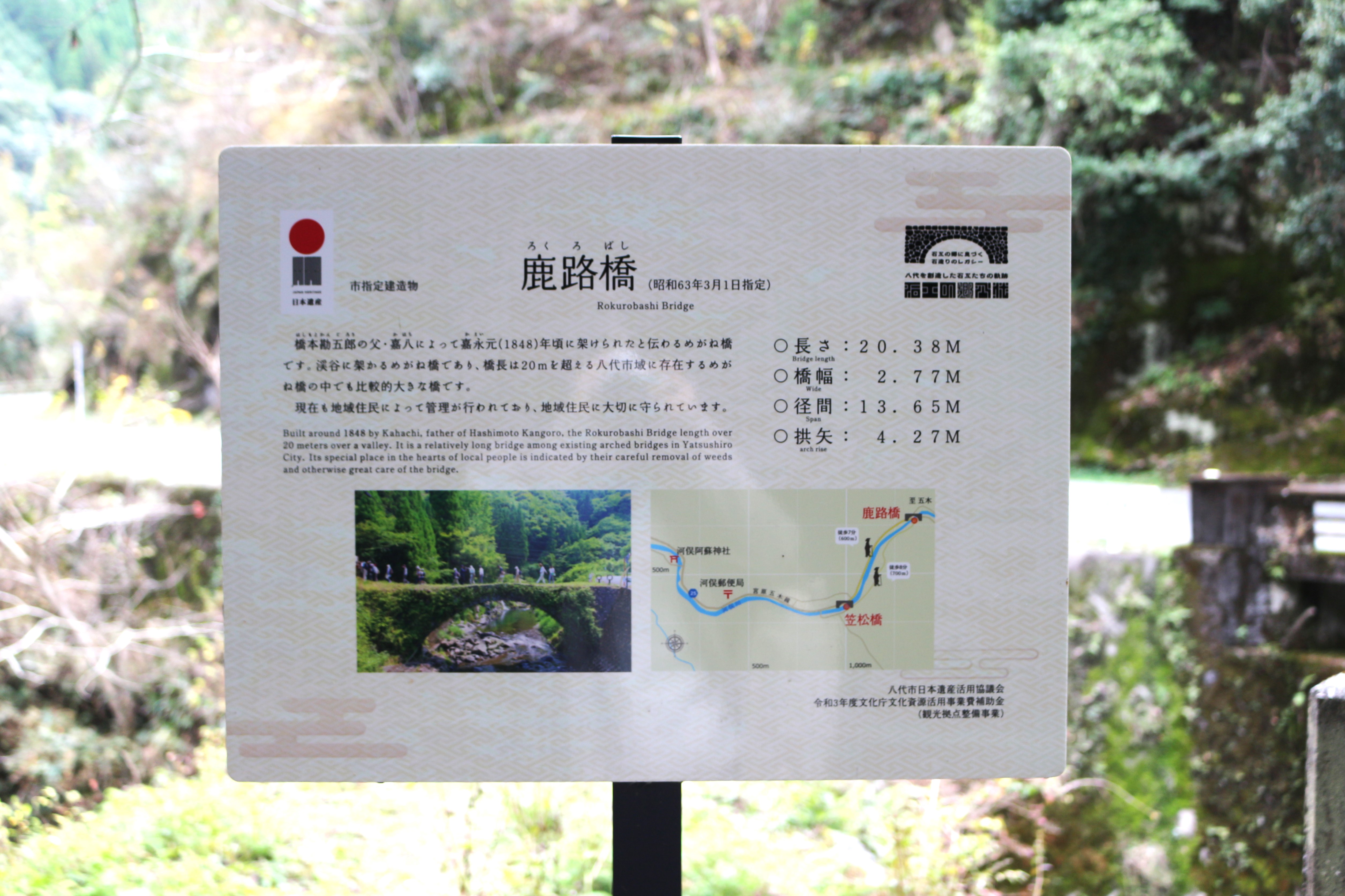 1ヶ所目は八代市東陽町河俣にある鹿路橋。嘉永元(1848)年に出来ためがね橋です。