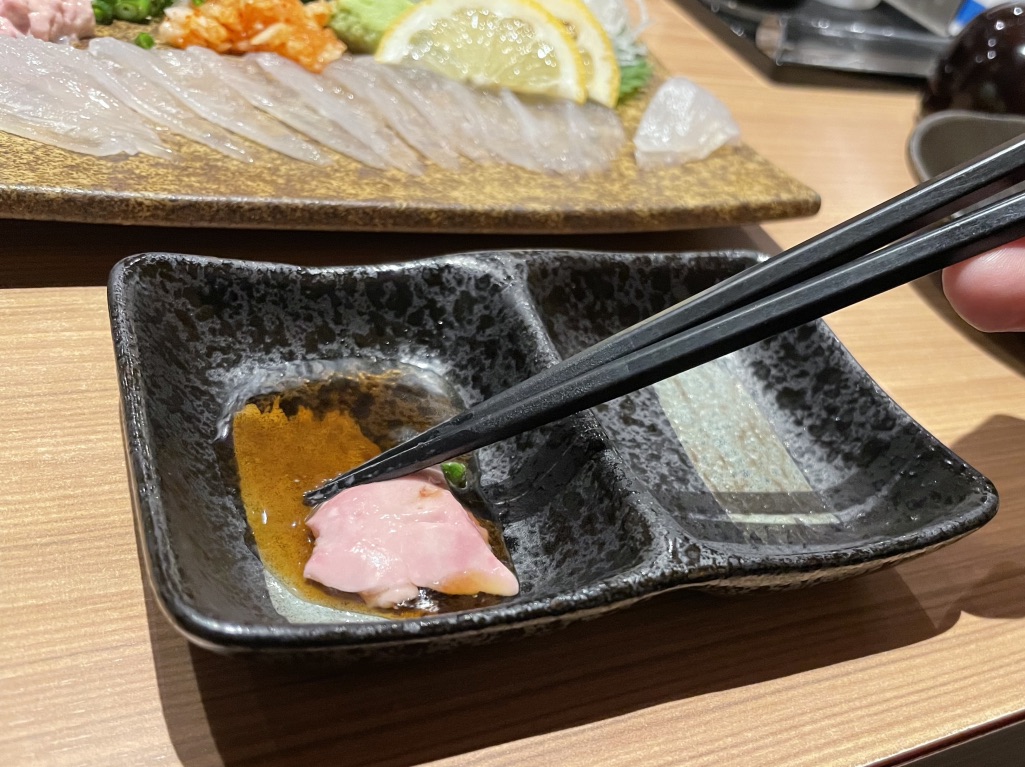 これを、肝醤油につけて、贅沢にお口に放り込む。