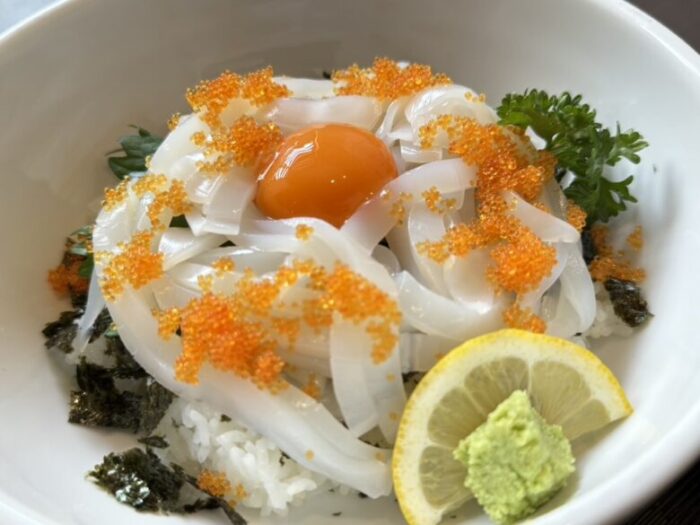 イカのお刺身がどっさりと乗ってます。ご飯の量とイカの量は5:5。