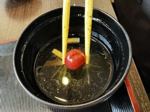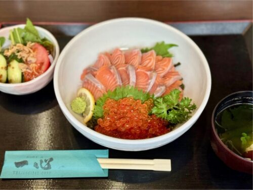 サラダとお吸い物がついてます。卵黄がなめらかさを演出し、とびっこが色合いをつけ、海苔が味のアクセントをくれます。