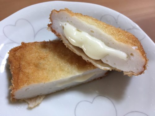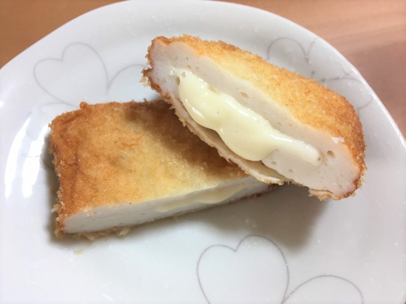 食べてみると、衣はサクッと香ばしく、中のすり身はふわふわのプリプリ!噛むたびに旨味が広がって、とろとろのチーズのマイルドさとも調和して、なんともまあ絶品!