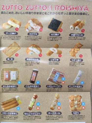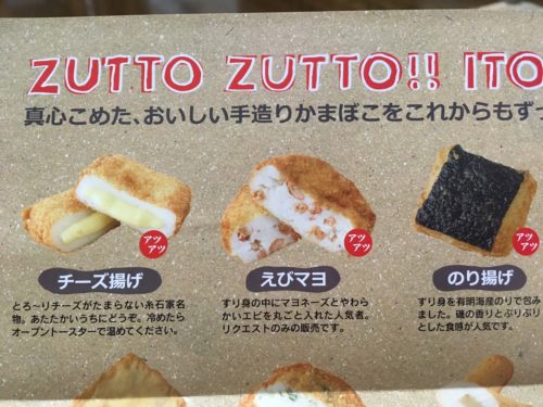 こちらがメニューです。注文を受けてから揚げてもらえる、揚げたてアツアツのかまぼこと、さしみかまぼこなどの冷たいかまぼこが並びます。
