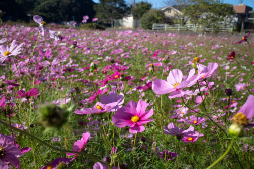 一面に咲き誇る濃いピンクから薄いピンク、白など色とりどりのコスモス。