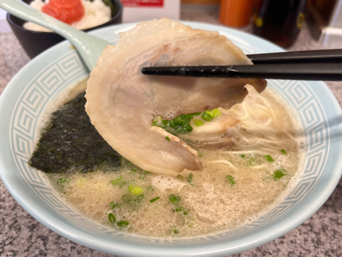 チャーシューは大きめにカットされたものが3枚。普通サイズでこれは贅沢ですね。柔らかく、脂身の比率も程よいチャーシューです。