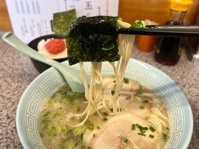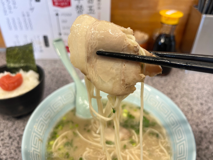 お次に麺を。博多ラーメンならではの細麺で、スープにしっかり絡んでいます。スープ、麺、スープ、麺と止まらなくなります。スープもどっかりしない絶妙なバランスなので、こってりな苦手な方でも食べられます。