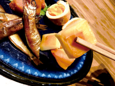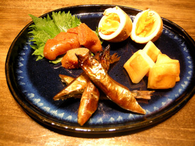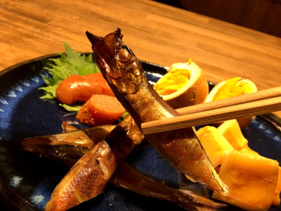 普段余り見ることのない「ししゃもの燻製」。ししゃもは必ずオスとメスの二匹を出すそうです。なぜかというと、メスの子持ちししゃもは卵に栄養を取られていて身の肉付きが弱いのだそう。子持ちししゃもが人気ですが、身の美味しさは脂が乗ったオスのほうが美味しいのだそう。