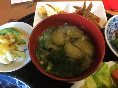 健康的な茄子のみそ汁。わかめも入って味わいも深く。それになんといっても個人的みそ汁絶対条件である、“熱々”のみそ汁でした。