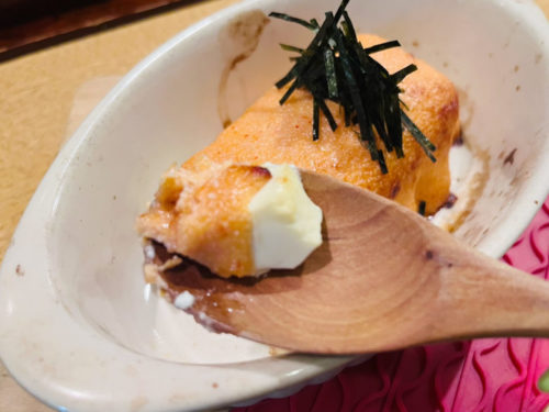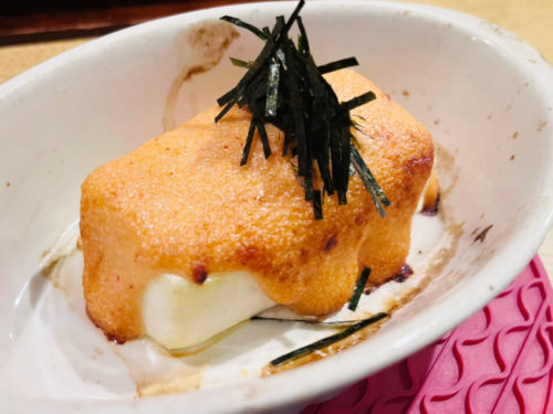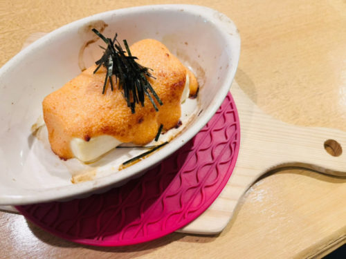 お店のオリジナルメニューの豆腐明太子マヨネーズ焼き。お店の方のご厚意で特別にハーフサイズにして頂きました。