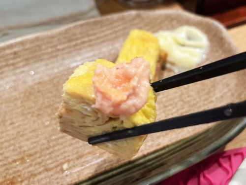 明太子マヨネーズをちょっと拝借して、玉子焼きに付けちゃったり。合わないわけないですよね。最高。