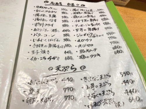 こちらは定番の居酒屋メニューに天ぷら。