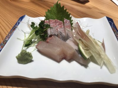カンパチの刺身、エビと大葉の春巻き、焼き鳥盛り合わせ、玉子焼き、馬スジの煮込みを注文しました!いざ、実食…