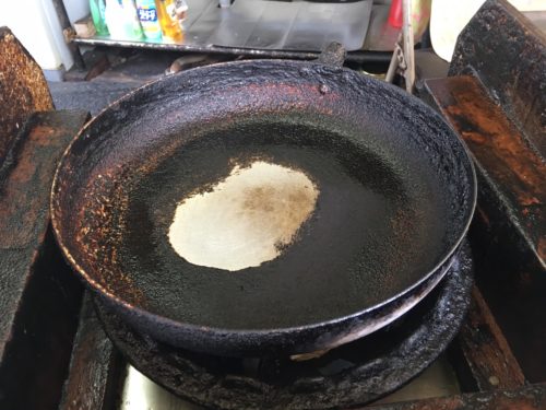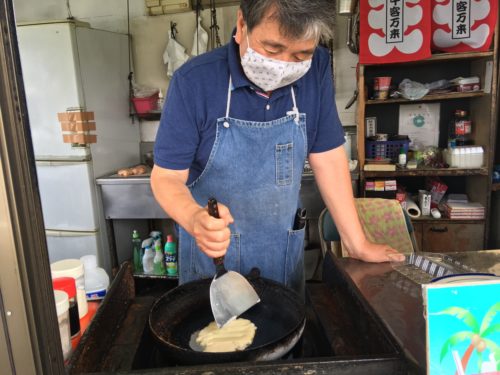 年季の入った、取っ手のとれたフライパンを使われていましたが、「これは昔、近所のおばあちゃんが、お好み焼きを焼いてほしい、とわざわざフライパンを持ってきてくれて、もらったものだけん、捨てきらんとですよ」と、ずっと買い替えずに使われています。
