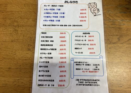 農林水産大臣賞を受賞された北部農園の野菜、そして抗生物質不使用の安全で美味しい梅肉ポークを使用されているのに、餃子にサラダ、野菜を中心とした小鉢がついてなんと600円!もちろんご飯・サラダはおかわり自由というかなりお得で満足できる内容。