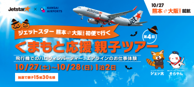 阿蘇くまもと空港で発着している格安航空会社(LCC)の「ジェットスター・ジャパン」が、10月27日(土)・28日(日)の一泊二日で、熊本県内に住む小学生(4〜6年生)とその保護者1人の親子15組30名を、大阪行きの「くまもと応援親子ツアー」に無料招待するそうです。