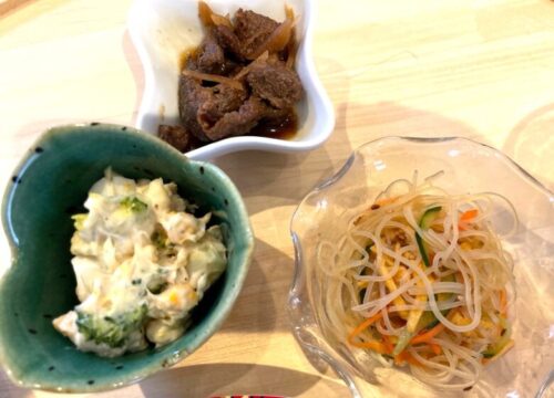 小鉢3種は、緒方エッグファームさんのこだわり卵たっぷりサラダに牛肉のしぐれ煮、春雨サラダを選んでみました。