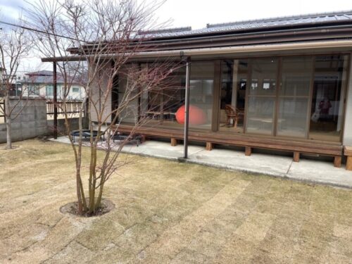 外には芝生を敷き詰められた広いお庭と、昔ながらの縁側があり、塀の外には思いっきり遊べる広場も…!子どもたちものびのび動けて、大人もくつろげる、最高の環境です。