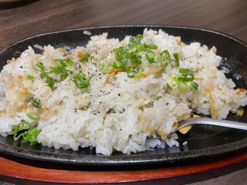 鶏の脂がしっかり出た鉄板でご飯を炒め、フライドガーリックを効かせたチャーハンとして提供されます。