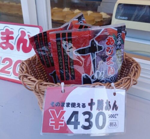 お店の商品はつぶあんとカスタードの回転焼きが2種類と、こだわりの十勝あん(500g)。