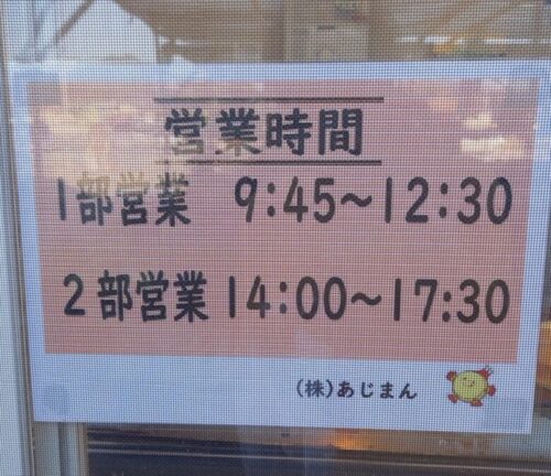 あじまんの営業時間は1部(午前)と2部(午後)に分かれており、12:30~14:00の間は購入できませんのでご注意を!