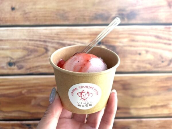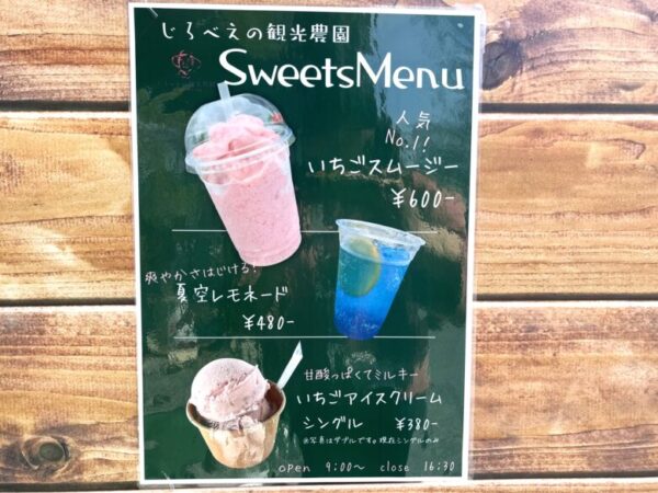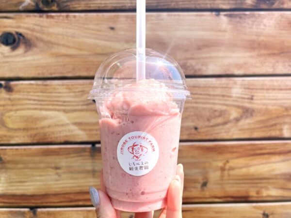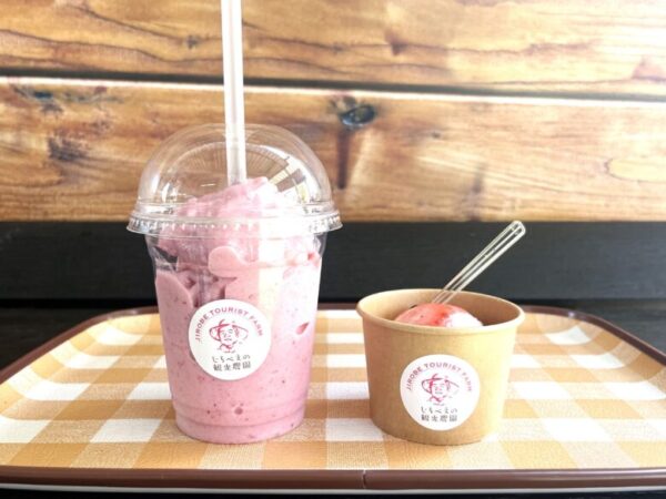 「じろべえの観光農園」オリジナルいちごスイーツは2種類。いちごスムージーといちごアイスクリームです。