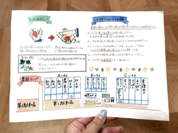 農園内には休憩所のハウスがあったり、いちごが栽培されているハウス内にもテーブルとイスが用意されているのでゆっくりいちご狩りを楽しめます。