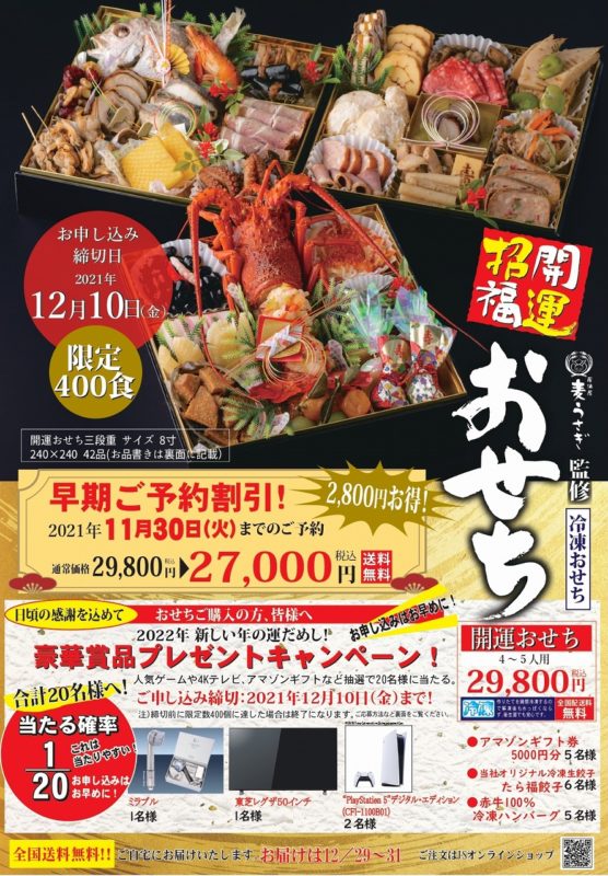 おせちが限定400食なので、すべての方が応募されたとして20人に1人は当選する確率ですね。