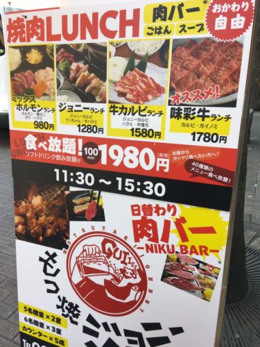 今年3月にオープンしたばかりの「もつ焼きジョニー」は、採算度外視で驚異的なコスパのお店でした。ちなみに食べ放題コースは、丸腸やウインナー、唐揚げやクッパ、アイス等40種食べ放題にソフトドリンク飲み放題付で1,980円。こちらも破格のお値段です。味彩牛ランチもあり、国産牛を楽しみたいという方でも安心して楽しめるお得なお店です。