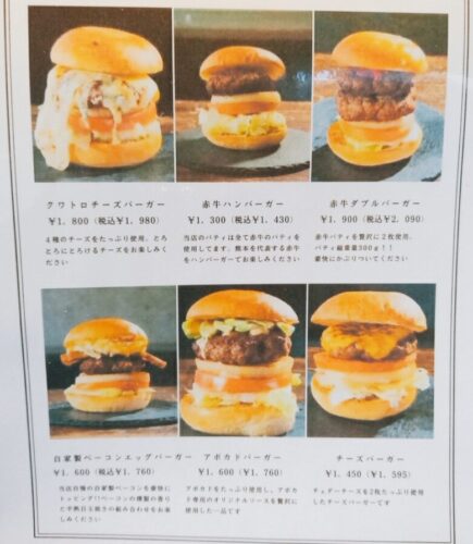 ハンバーガーは、ベーシックな「赤牛バーガー」(1300円、ダブルは1900円)を始め6種類。