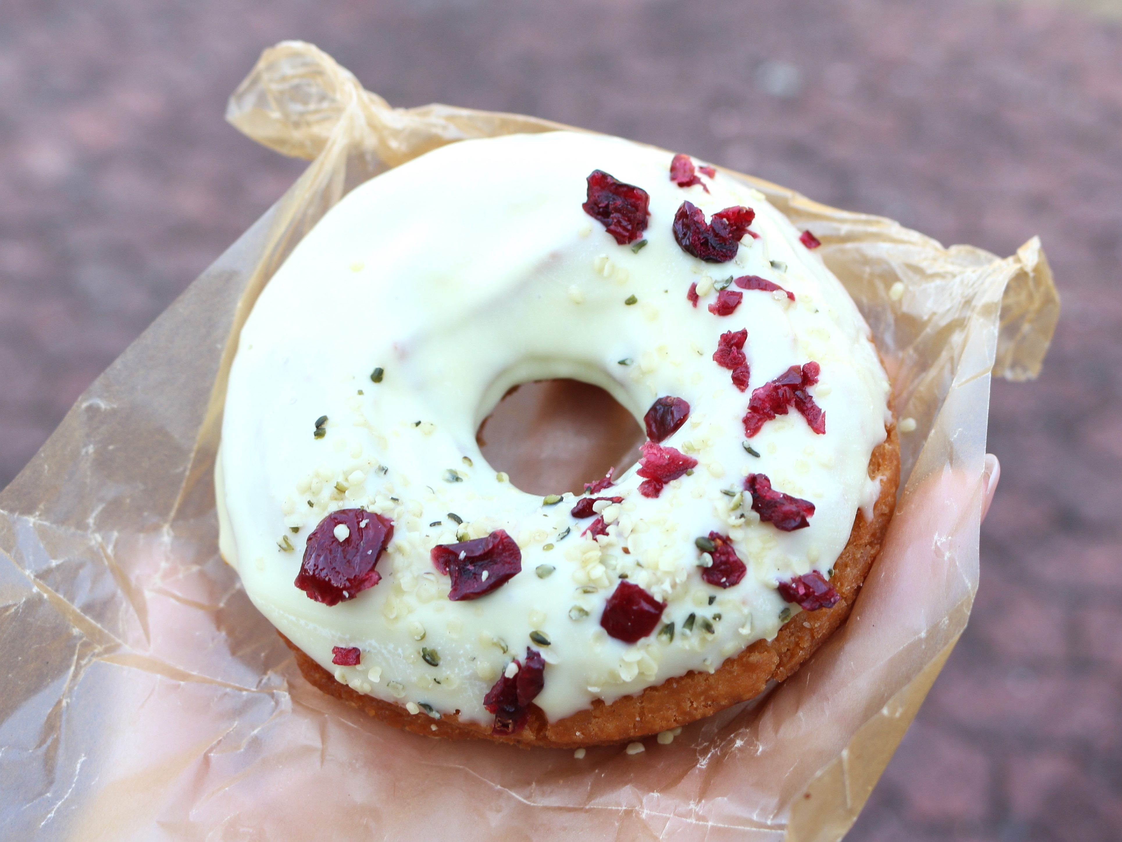 さっぱりしたドーナツにパリッとコーティングされたホワイトチョコ、そしてその上にあるクランベリーが甘酸っぱくて美味!