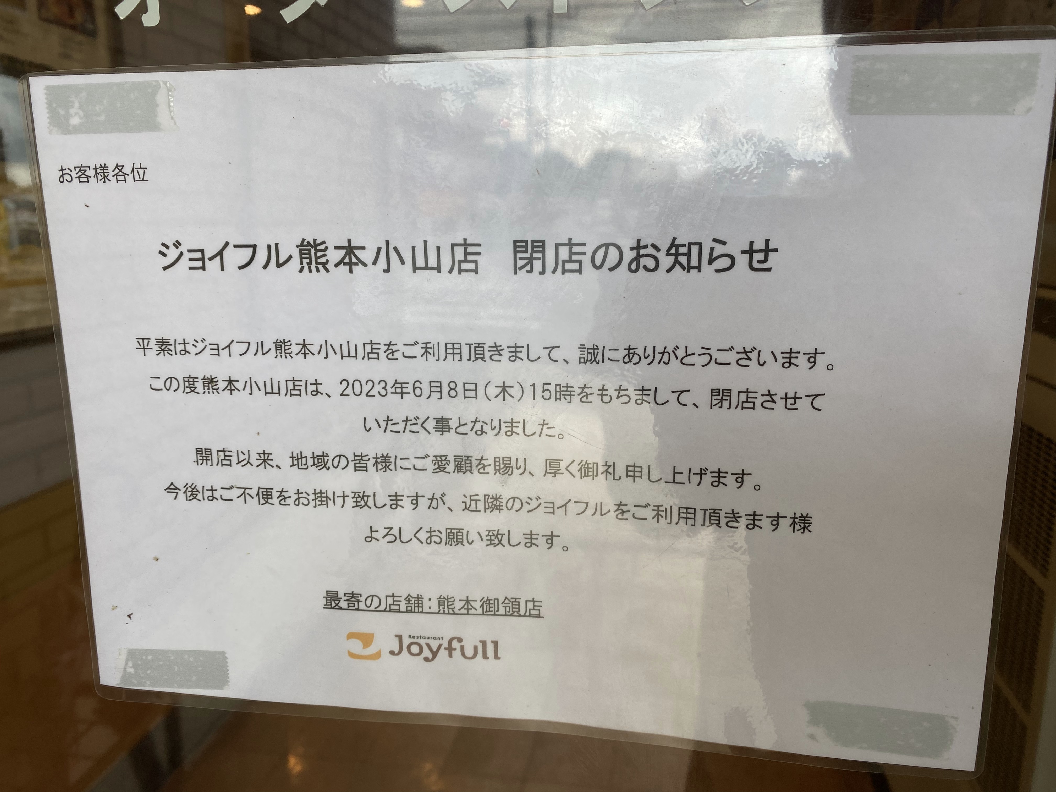 今度は熊本市東区にあるジョイフル小山店が6月8日15時をもって閉店だそうです。