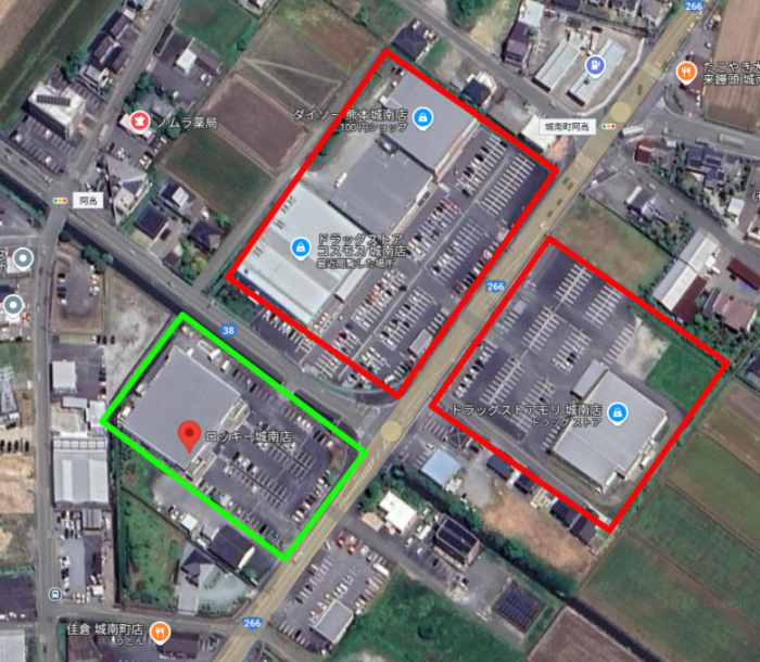 緑色が「ロッキー城南店」です。