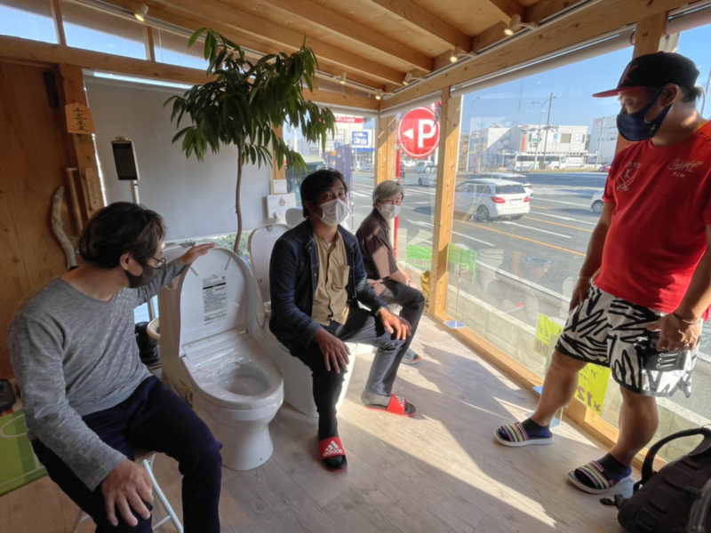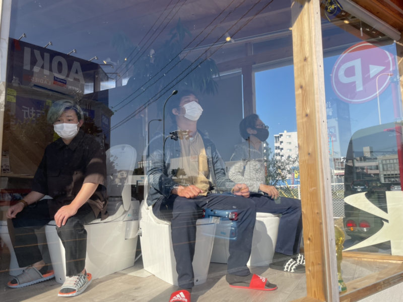 実際にトイレに座ってトイレを選ぶ一同。自分の推し便器を選ぶことに。