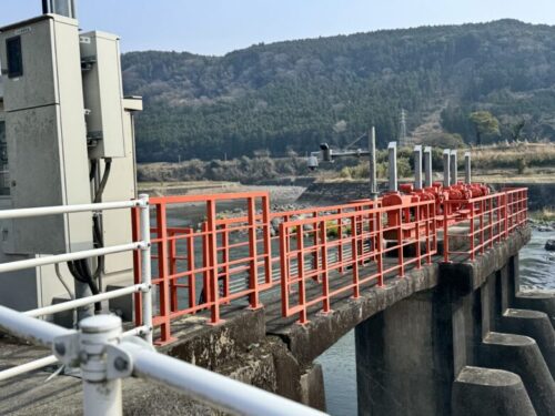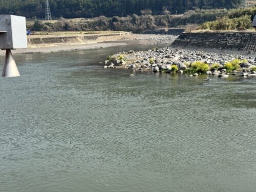 堰き止められた流れは穏やかに、春の空の下輝いておりました。